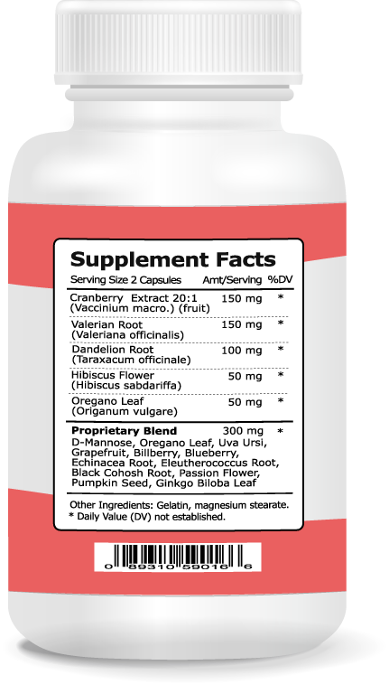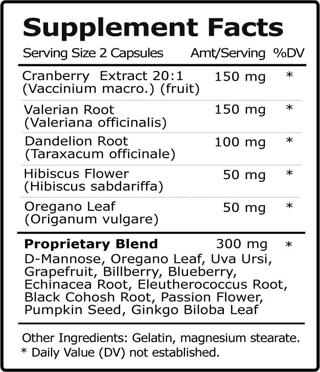 D-Mannose, Oregano Leaf, Uva Ursi, Grapefruit, Billberry, Blueberry, Echinacea Root, Eleutherococcus Root, Black Cohosh Root, Passion Flower, Pumpkin Seed, Ginkgo Biloba Leaf