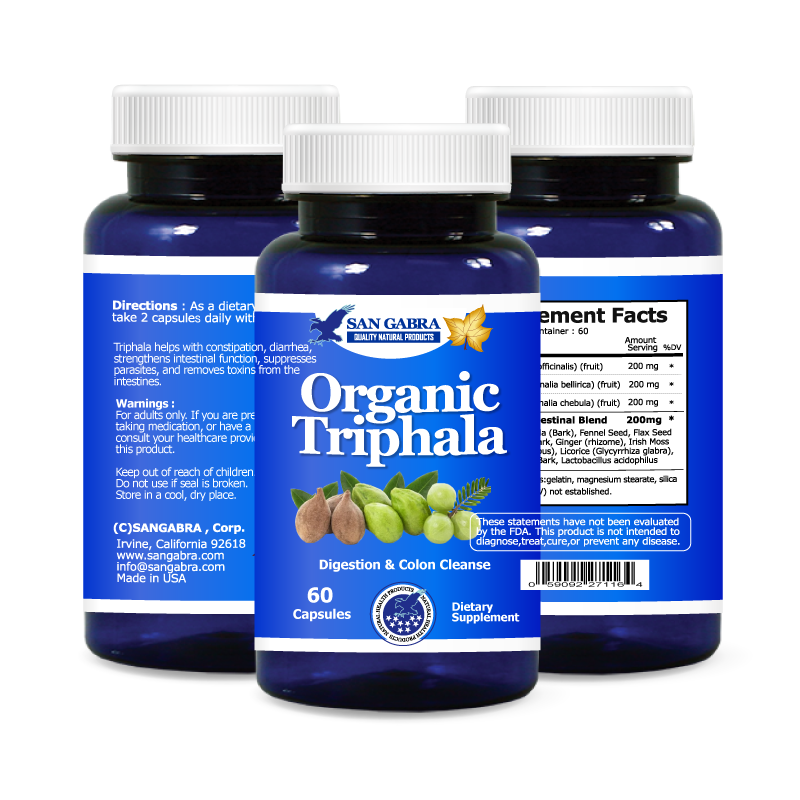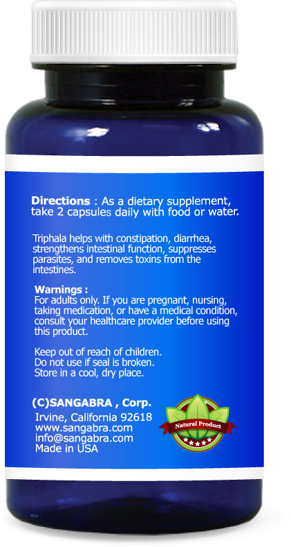 Triphala is known to strengthen intestinal function by resolving chronic constipation and diarrhea, and to help suppress parasites, remove intestinal toxins, and prevent obesity.