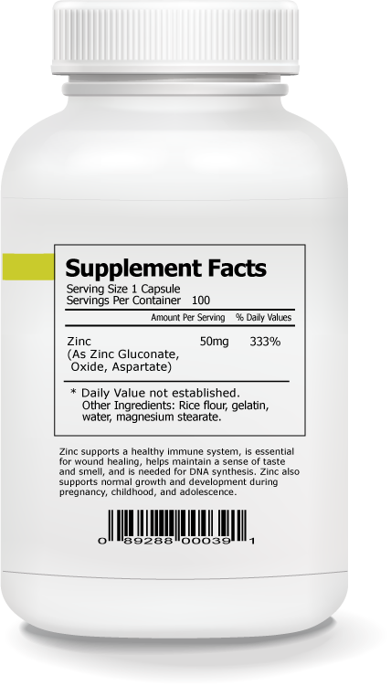 Zinc supports a healthy immune system, is essential for wound healing, helps maintain a sense of taste and smell, and is needed for DNA synthesis. Zinc also supports normal growth and development during pregnancy, childhood, and adolescence.